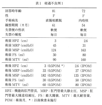 対象100例にアンケートを送付しましたが有効回答数は44例(うち16例女性)でした。年齢は中央値67歳で観察期間は中央値61か月です。満足度、推薦度とも良好でしたが経過不良例が数例おられました。手術前から内圧検査、直腸感覚検査不良例は5年目も経過が良くありませんでした(経過不良例1)。また、術後早期に脱出症状の訴えがあった症例はやはりアンケート回答時も訴えは変わっていませんでした(経過不良例2)。アンケート回収率も課題でした(良性疾患は回収率が悪い)。