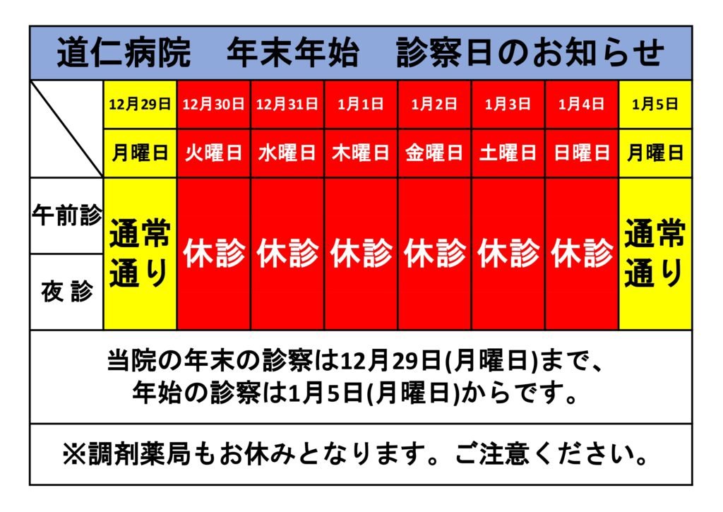 内科・外科・整形外科・大腸肛門科・炎症性腸疾患(IBD)・便秘・内視鏡検査なら大阪寝屋川の道仁病院|令和7年年末(令和8年年始) 診察日のお知らせ