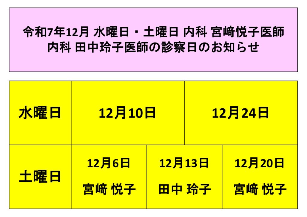 新着情報 診察担当日令和7年12月 水曜日・土曜日 内科宮﨑悦子医師 内科田中玲子医師 診察日のお知らせ 令和7年12月 水曜日・土曜日 内科宮﨑悦子医師 内科田中玲子医師 診察日のお知らせ 2025.11.29 診察担当日 «新しい記事 一覧に戻る 以前の記事»